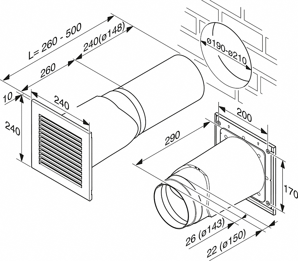 • Odťahová rúra do steny, Ø 150 mm, pre odvetrávanie odsávačov pár